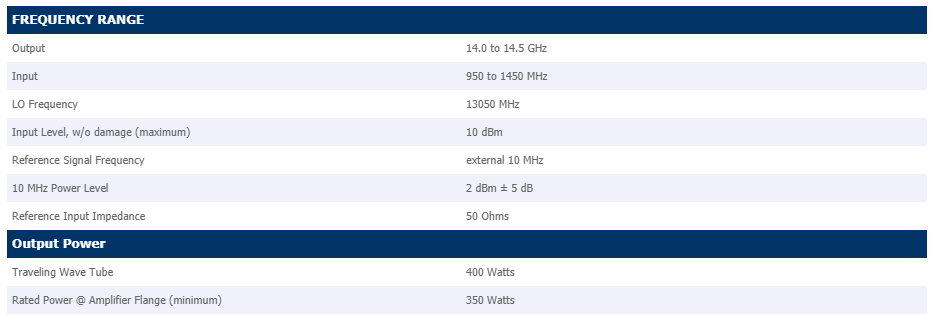 The XTU-400 uses high efficiency dual-stage collector Traveling Wave Tubes (TWT). Some benefits of this type of TWT are: reduced prime power consumption, lower internal operating temperatures, and reliability enhancement. These benefits are obtained for both the linear and saturated modes of operation.